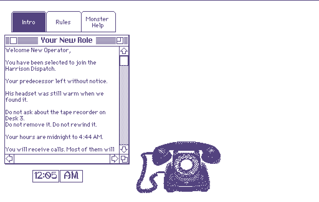 A phone rings, a voice answers. But not all voices are as truthful as they appear. Play as a Phone Operator in the town of Harrison as you try to figure out what is happening behind these phone calls.